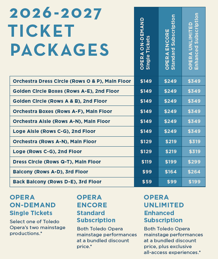 - EXCLUSIVE SUBSCRIBER DISCOUNTS: As a subscriber, you receive 20% off additional ticket you purchase for Toledo Opera performances.