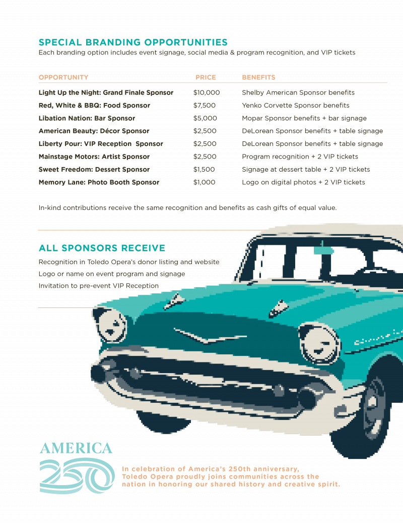 Opera Gala Route 250 is Toledo Opera’s signature celebration of American creativity, community, and culture – set against the unforgettable backdrop of the Millbury Classic Cars & Trucks Museum. As we honor America’s 250th anniversary, we invite you to partner with us in fueling the artistry, education, and engagement that define Toledo Opera’s impact across our region.